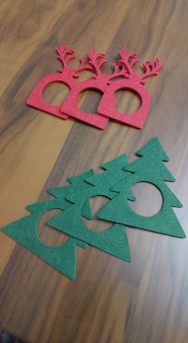 Yılbaşı temalı, renkli keçe peçete halkaları, çam ağacı ve geyik boynuzu şeklinde, sofralarınıza şenlik katmak için uygun. 3 adet yeşil çam ağacı+3adet geyik boynuzu figüru vardır.