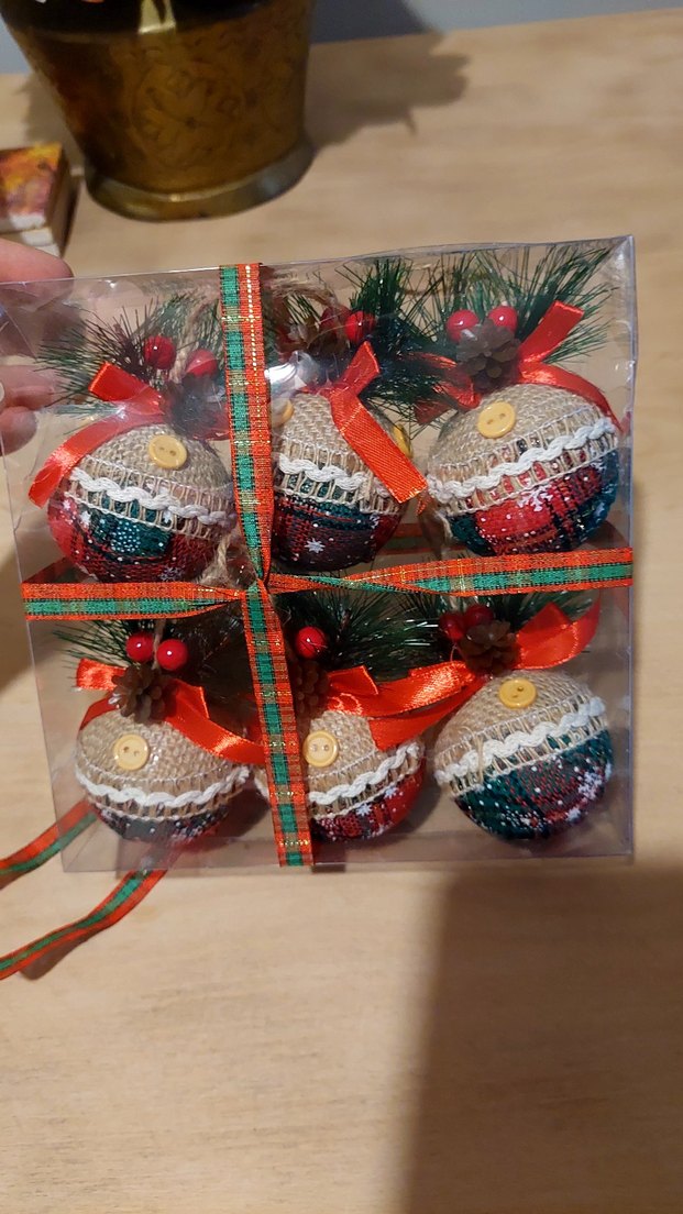 Renkli yılbaşı süs topları, dekoratif yeşilliklerle kutu içinde ve şeritle bağlanmış şekilde sunulmuştur.