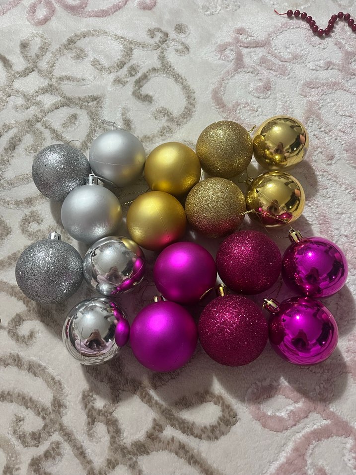 Gümüş, altın ve pembe tonlarda mat, parlak ve simli yüzeylere sahip renkli yılbaşı süs topları seti. Hepsi satışta ayrı ayrı satmıyorum istemeyen ışığı almayabilir