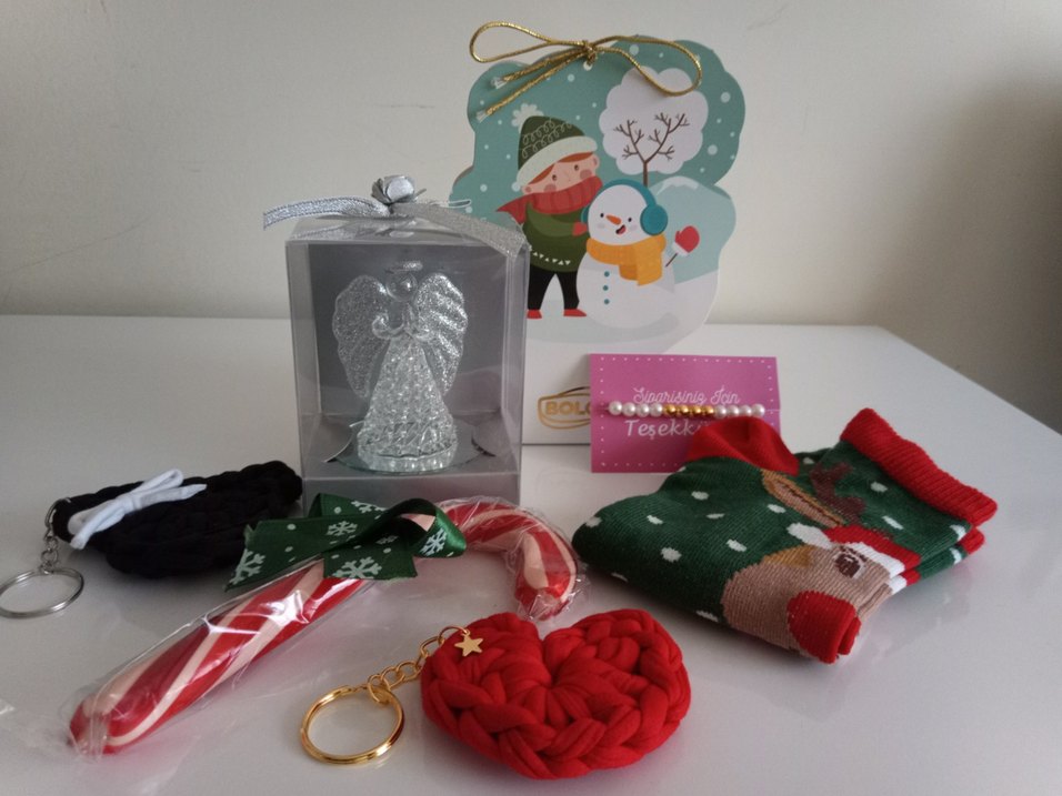 Cam melek süsü, şeker kamışı, örme kalp anahtarlık ve yazılı yılbaşı kartı içeren renkli yılbaşı aksesuarları.