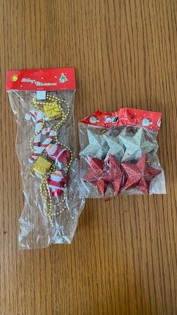 Şeker kamışı, hediye ve Noel Baba figürlü renkli yılbaşı süsleri ile kırmızı ve gümüş simli yıldız süsleri içerir.