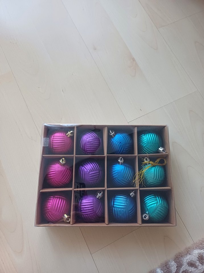 Pembe, mor, mavi ve turkuaz renklerde dokulu yılbaşı süsü topları seti, yılbaşı dekorasyonuna uygun.İsteyen olursa 2 adet var elimde