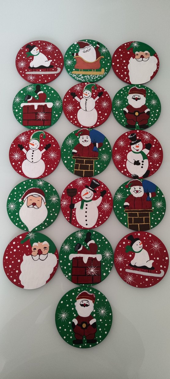 Çeşitli yılbaşı ve kış temalı figürler içeren renkli yuvarlak süsler. Kar tanesi, Noel Baba ve kardan adamlar bulunur. her biri 10 cm çapında 3 mm kalınlığında ham MDF üzerine akrilik boya ile çizilip boyandı ve verniklendi.bardak altlığı olarak adet fiyatı 75 TL dir.. tercih etmek isterseniz istediğiniz renk desen model çalışılabilir #bardakaltlığı #magnet #öğretmenlergünü #öğretmenlergünühediyesi