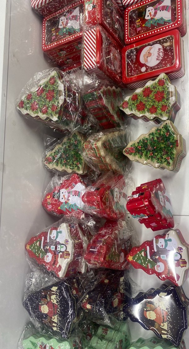 Renkli yılbaşı temalı metal kutular, ağaç ve figür şekillerinde, küçük hediyeler için uygun.