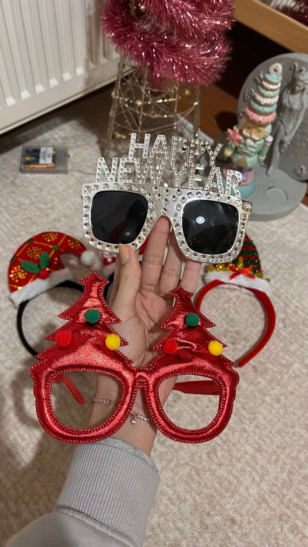 Kırmızı yılbaşı temalı, renkli ve taşlı "Happy New Year" yazılı parti gözlükleri. Toplam fiyatıdır 3 adet taç ve iki adet gözlüktür eğlence paketi olarak almıştım kullanılmadı #eğlence #yılbaşı #noelbaba #noel #yılbaşıtaç #taç #yılbaşıgözlük #parti #partimalzemeleri
