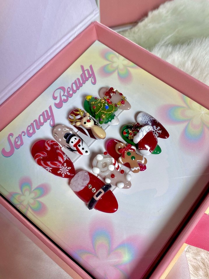 Noel Baba, kardan adam, çam ağacı ve zencefilli kurabiye gibi tasarımlarla renkli yılbaşı temalı tırnak süslemeleri.