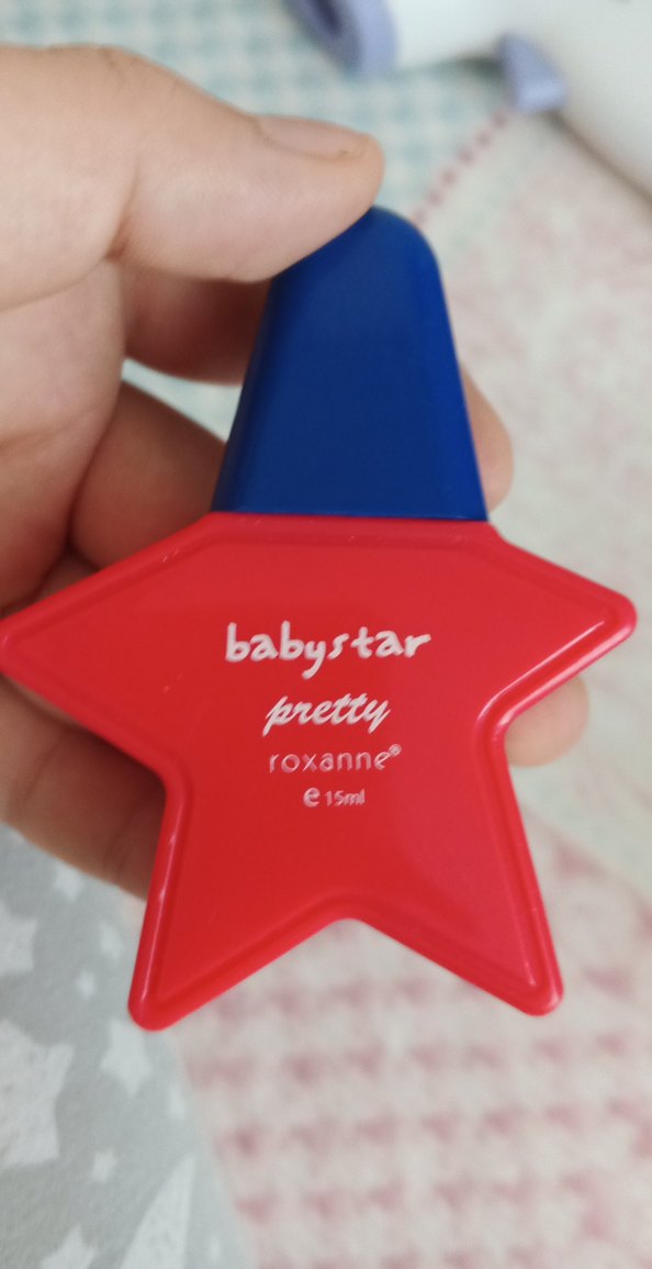 Renkli yıldız şeklinde, 15ml kapasitesinde bebek şişesi üzerinde "babystar pretty roxanne" yazısı bulunur. ⭐ hafif bir kokusu vardır bebek kokusu