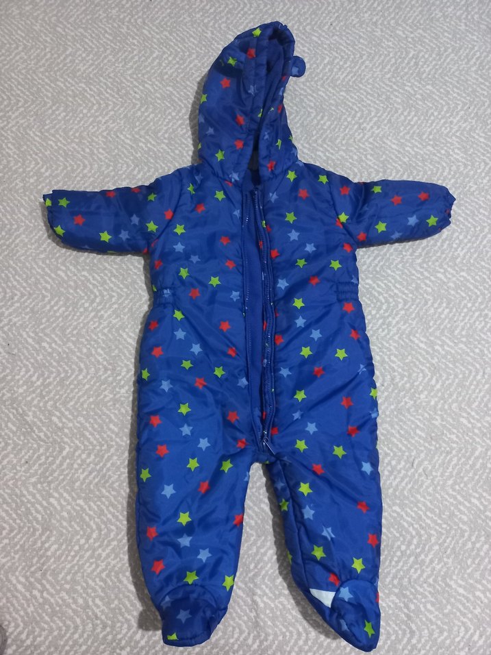 Renkli yıldız desenli, mavi bebek astronot tulumu. Örgü dokulu, kapüşonlu, yumuşak ve sıcak içi polar kumaştan yapılmıştır.
