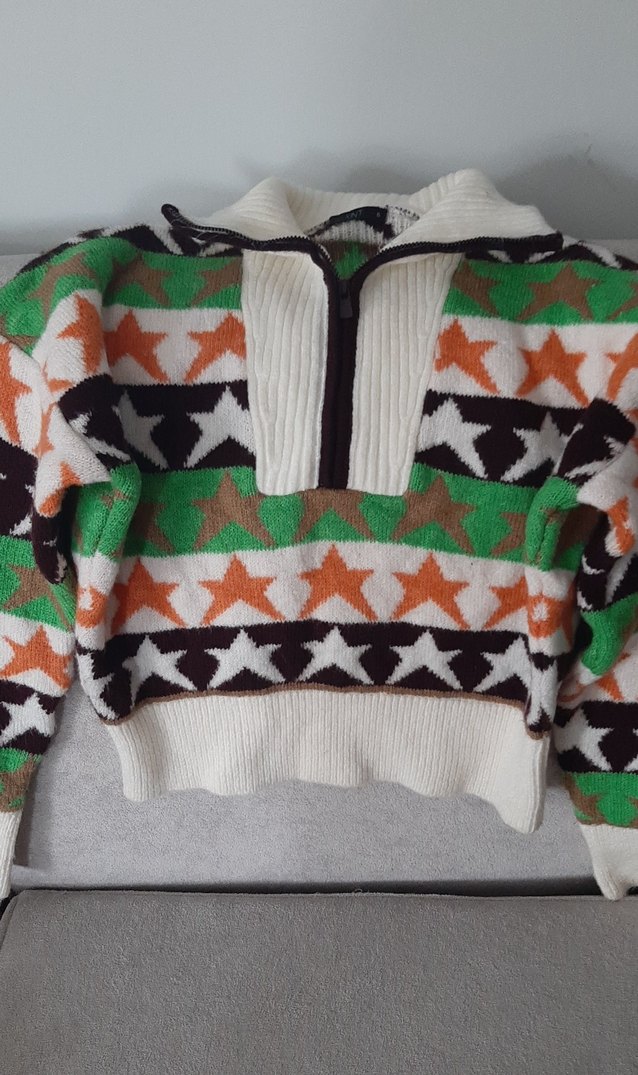 Yüksek yakalı, uzun kollu ve renkli yıldız desenli örgü, bohem ve retro tarzda, günlük kullanıma uygun fitted kadın kazak.