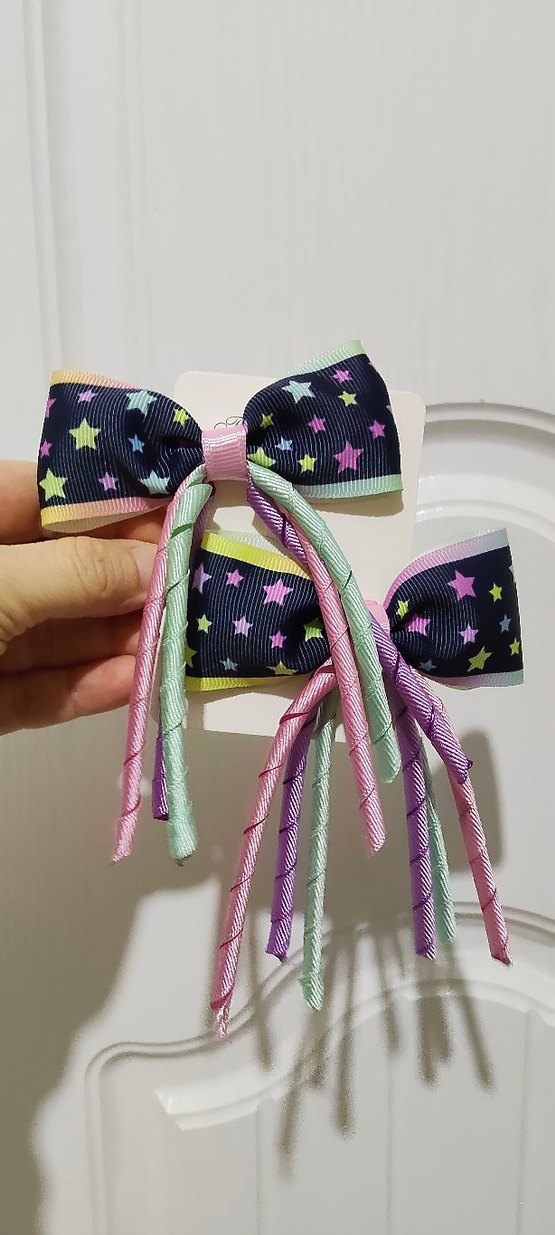 Renkli yıldız desenli, sallanan kıvrımlı kurdeleli, rock punk tarzı çift toka
