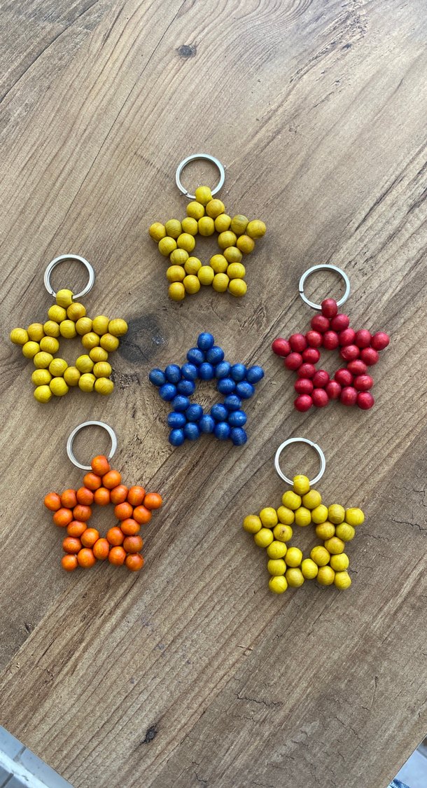 Küçük boncuklardan yapılmış renkli yıldız şeklinde kadın anahtarlık seti. Her biri metal halka ile kolayca takılabilir. Hediyelik eşya toplu satış yapılabilir
