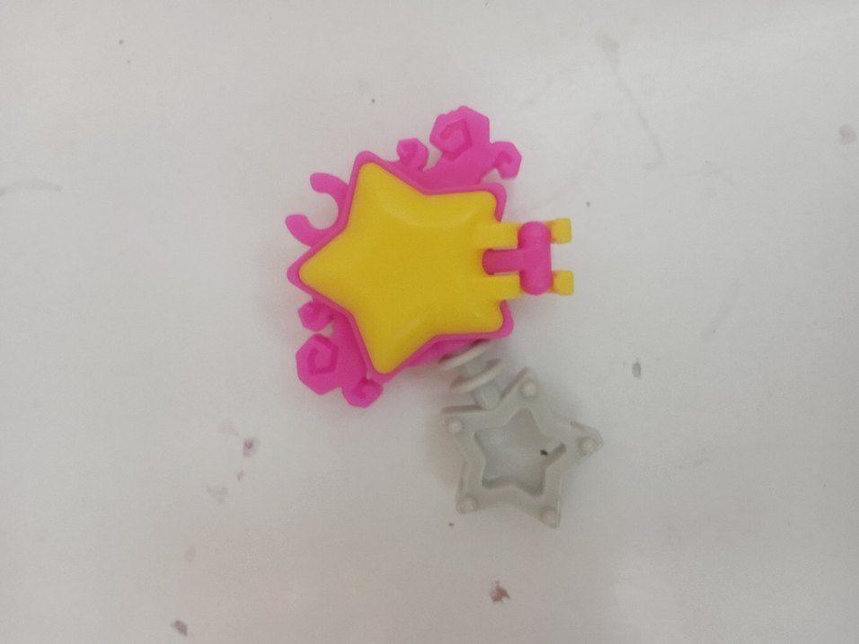 Sarı yıldız ve pembe detaylara sahip renkli oyuncak, çıkarılabilir beyaz yıldız parçası ile eğlenceli ve dikkat çekici. ⭐