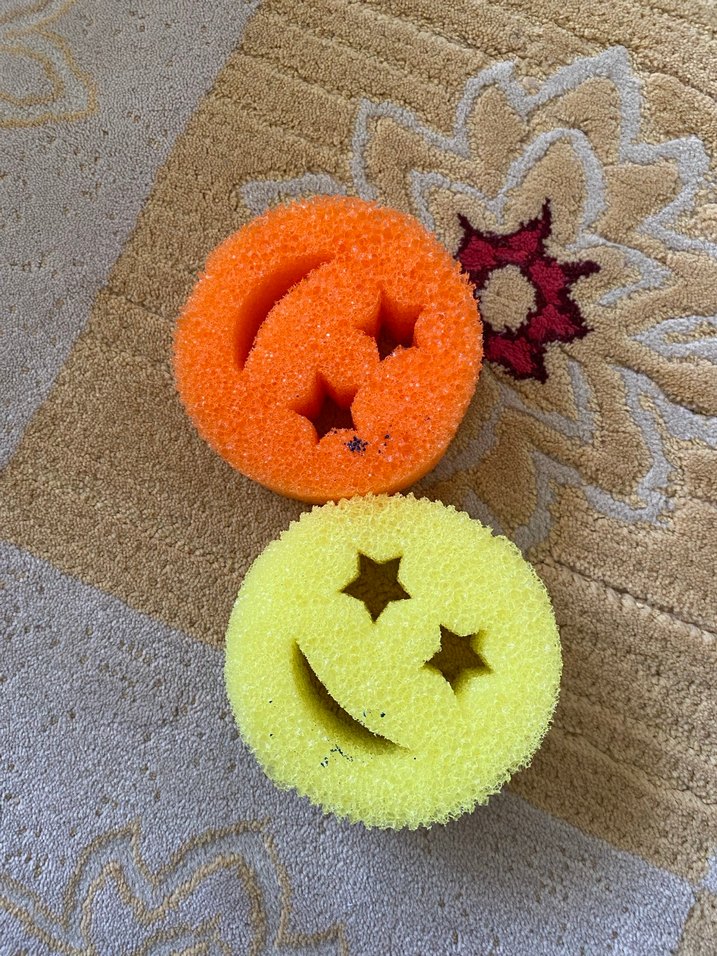 Yıldız şeklinde gözleri ve gülümseyen yüz desenli, yumuşak dokulu renkli banyo süngerleri.