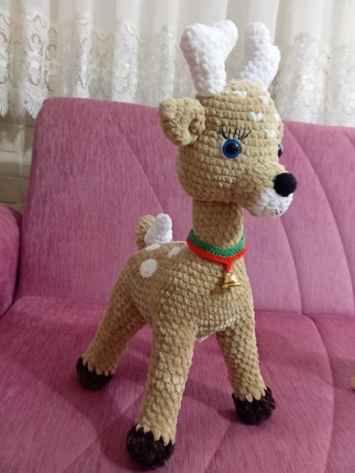 Yumuşak dokulu, renkli ve camel tonlarında peluş geyik oyuncak. Detaylı boynuzları ve küçük çanlı tasması bulunur. Dört ayak üzerinde durur.