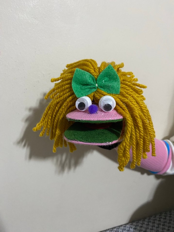Bu renkli peluş kukla oyuncak, sarı yün saçlar, büyük gözler, yeşil fiyonk ve geniş ağız içerir. Yumuşak ve eğlencelidir.