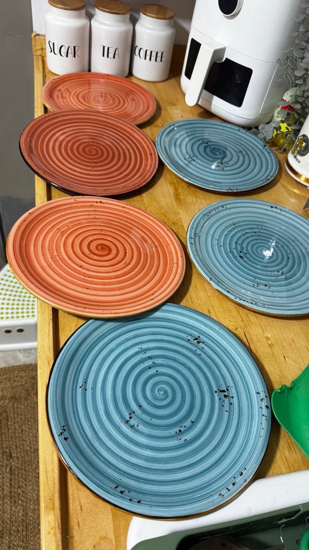 Mavi ve toprak tonlarında, spiral desenli renkli seramik yuvarlak tabaklar. Yemek servisi için rustik bir dokunuş sağlar. ️