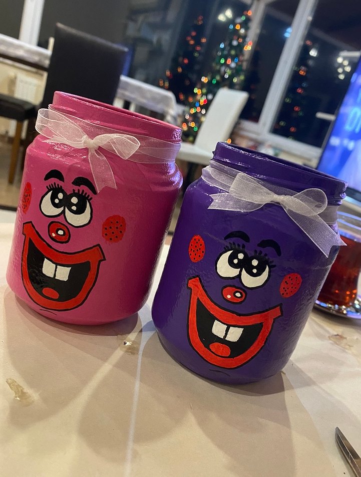 Mor ve pembe renklerde, kurdele fiyonklarıyla süslenmiş, gülen yüz desenli renkli çocuk kavanozları. İstenilen renkler yapılır. 2 ADET fiyatıdır.
