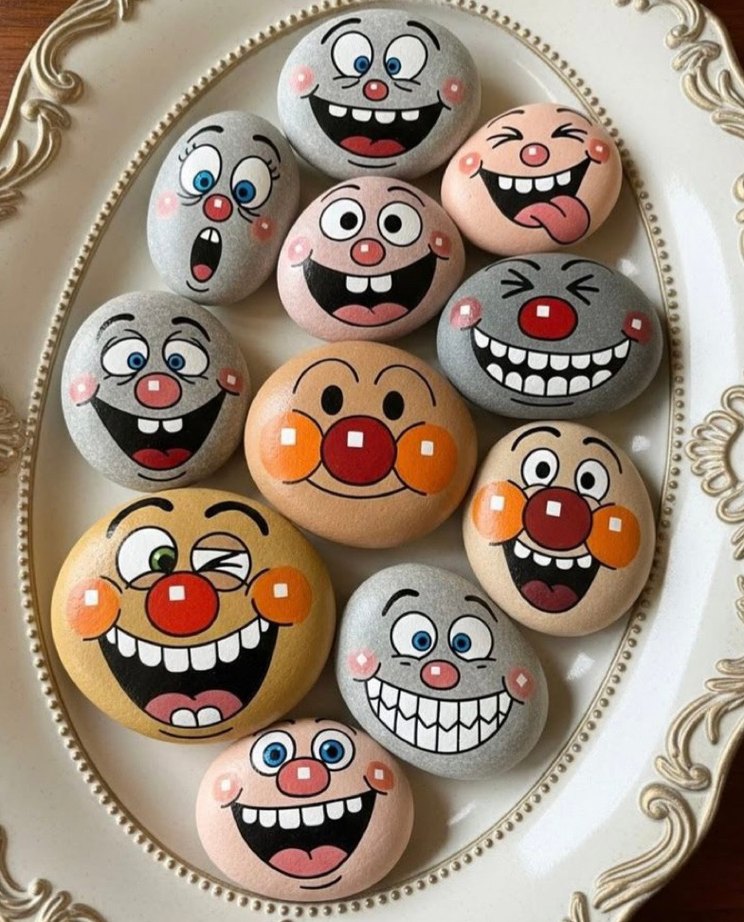 Farklı renklerde ve ifadelerde çizilmiş yüzlerle süslenmiş taş seti, dekorasyon veya oyun için uygundur.