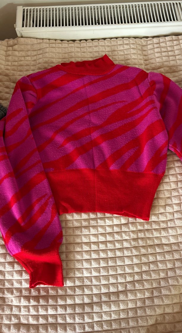 Renkli zebra desenli, balıkçı yaka, uzun kollu, sentetik kumaştan yapılmış, rahat ve şık kadın kazak.