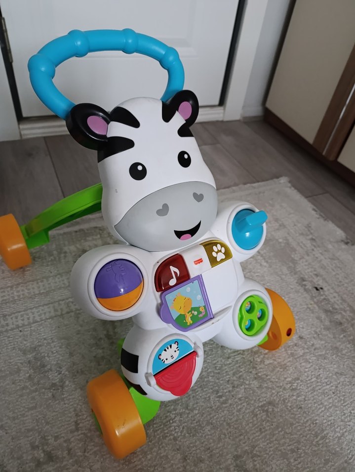 Renkli zebra desenli, interaktif düğmeli ve sağlam saplı bebek yürüteci, bebeklerin yürümesini destekler.