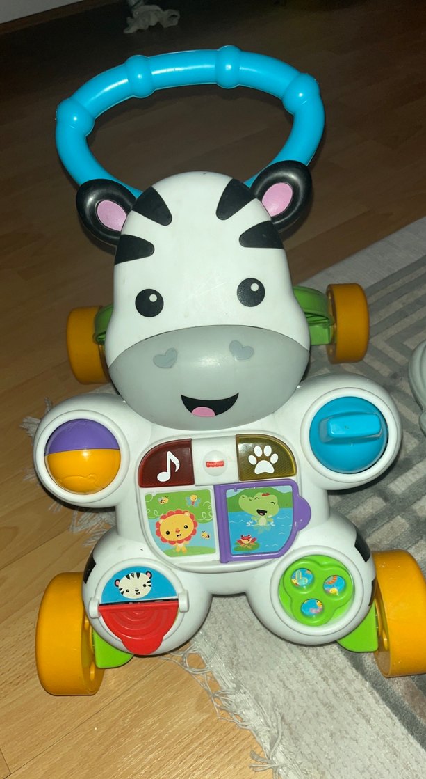 Zebra desenli, renkli ve interaktif düğmelere sahip bebek yürütücü, yürüme ve oyun için destek sağlar.