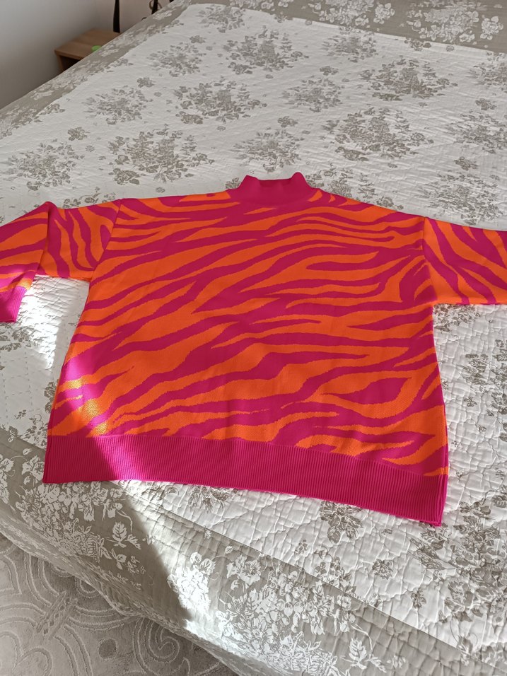 Renkli zebra desenli, boğazlı ve uzun kollu kadın kazak. Sentetik kumaştan örülmüş, bol kesim ve rahat bir yapıya sahiptir. Bohem ve retro tarzına uygun, dış mekan kullanımı için idealdir.