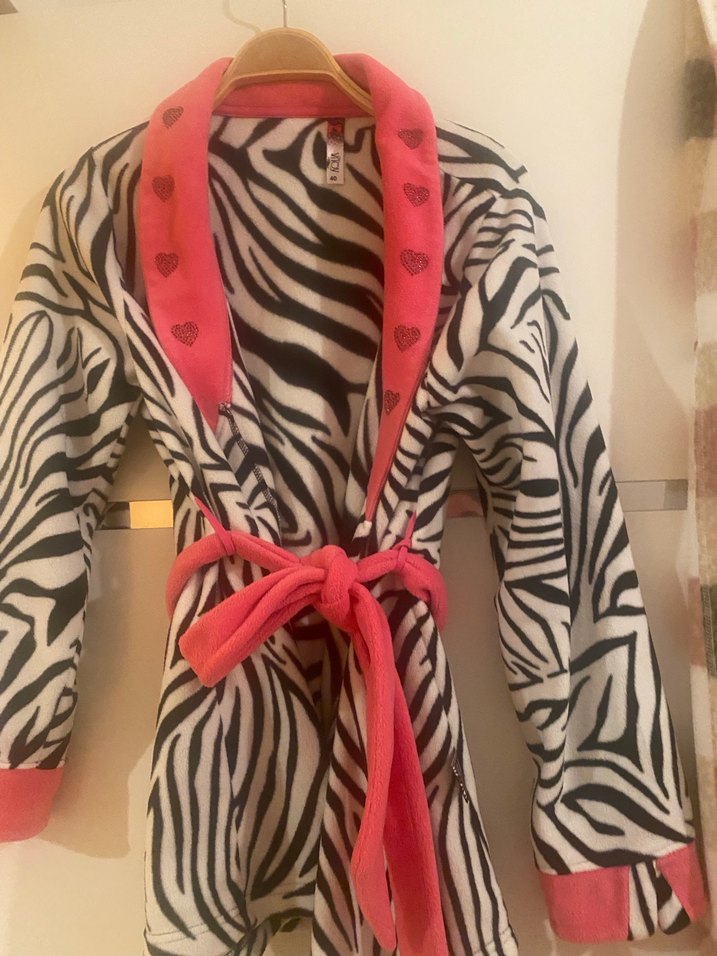 Renkli zebra desenli, askılı kollu ve midi boy, fitted kesim kadın bornoz. Pembe yaka ve kemer ile rahat ve canlı bir sokak stili sunar.