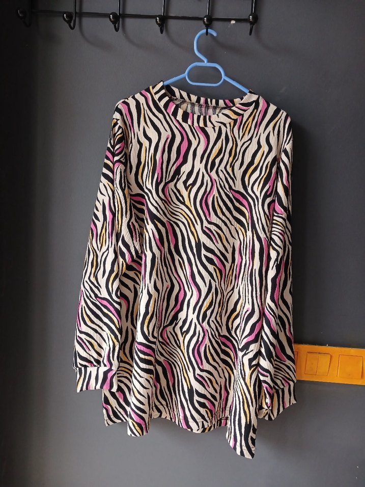 Renkli zebra desenli, uzun kollu ve bol kesim kadın bluz. Sentetik kumaştan, pile detaylı ve yuvarlak yakalı, rahat ve bohem tarzda.