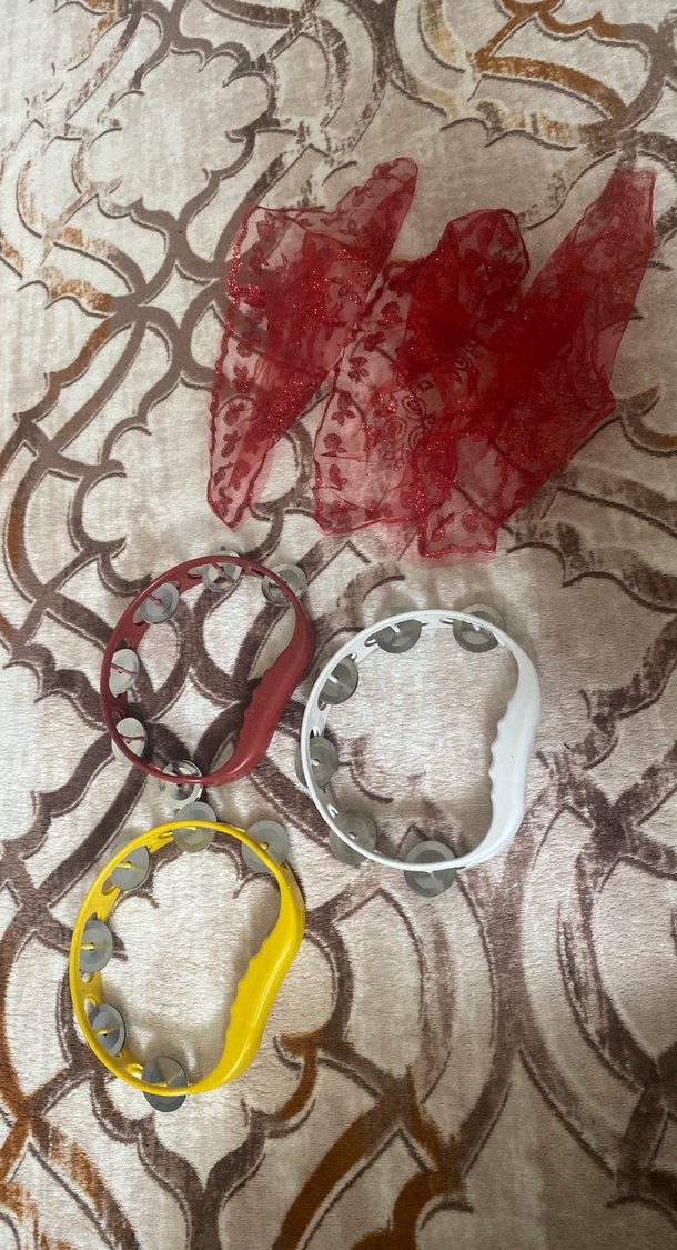 Kırmızı, beyaz ve sarı renklerde üç zilli köpek aksesuarı ile birlikte üç kırmızı dekoratif fular içerir.