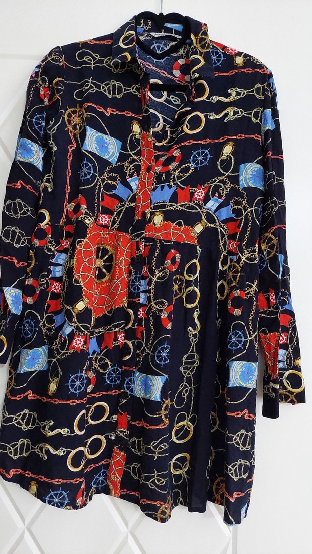 Renkli zincir desenli, uzun kollu, bol kesim ve uzun boylu bohem tarzda tekstil tunik. Günlük kullanıma uygundur,