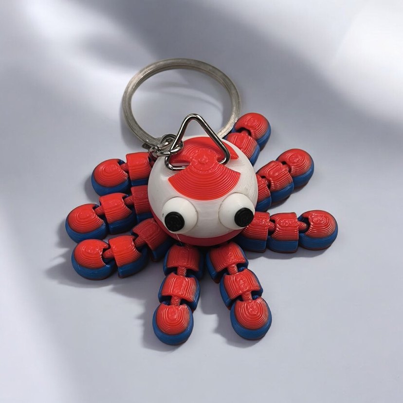 Zincir detaylı, kırmızı ve mavi renklerde renkli ahtapot anahtarlık. Trend belirleyicilere ve avangart tarzı sevenlere uygun.