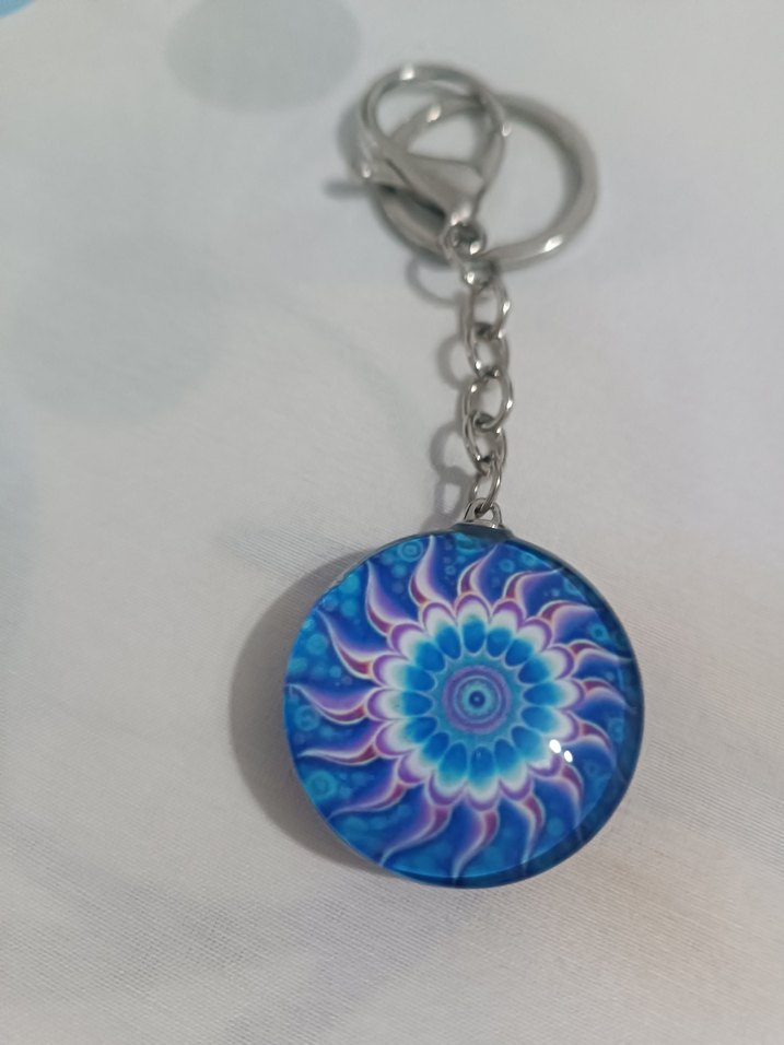 Renkli zincir detaylı, mavi bohem tarzda mandala desenli yuvarlak anahtarlık.