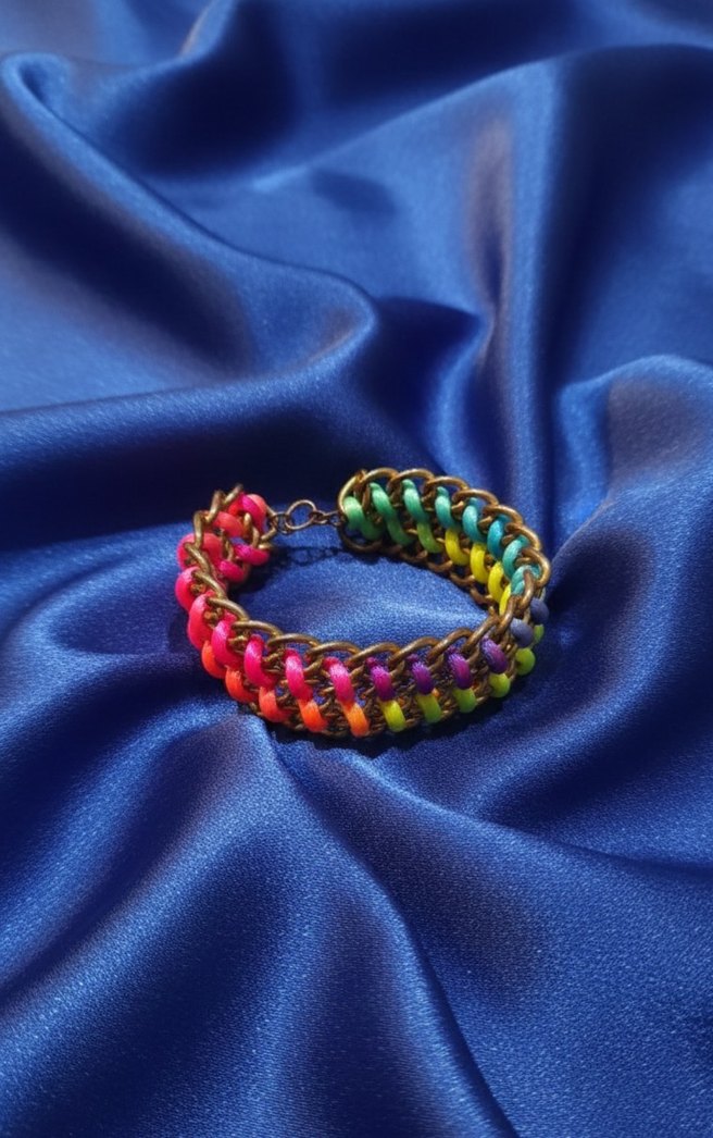 DİY Renkli ipin metal zincirle harika birleşimi. tie-dye desenli bohem ve retro tarzda kadın bileklik, parti için uygun.