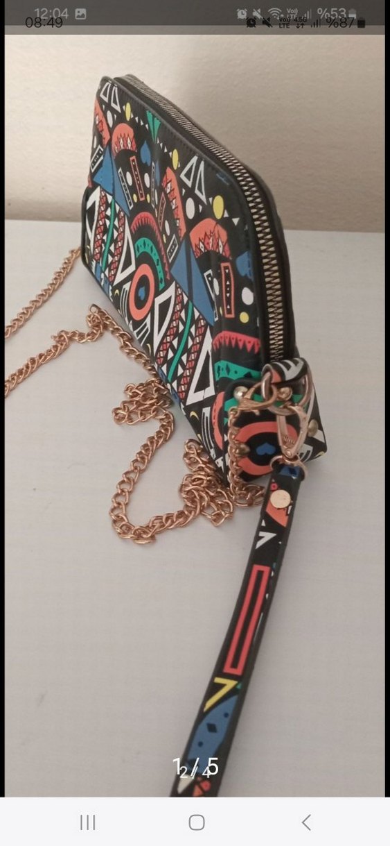 Kadınlar için çok renkli baskılı, zincir detaylı koyu renkli sentetik kumaş çanta. Bohem ve retro tarzı yansıtır. Günlük kullanım için uygundur.