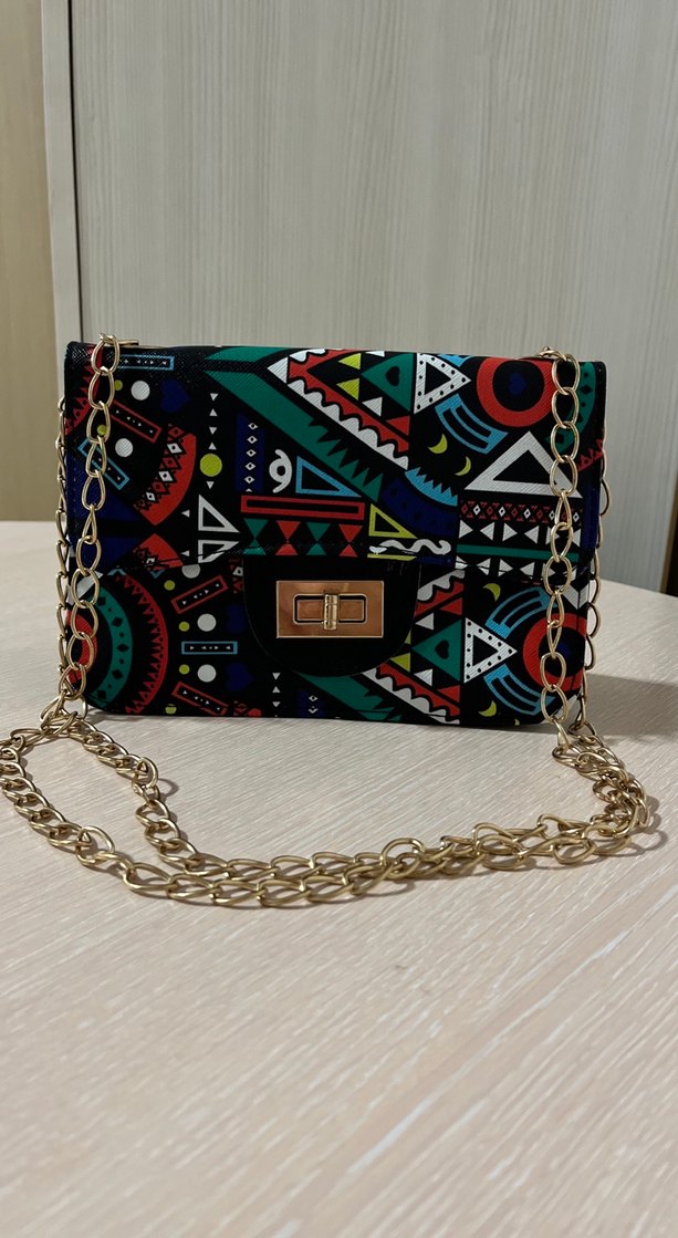 Renkli baskılı sentetik kumaştan, altın zincir detaylı bohem kadın çantası. Günlük kullanım için uygun.