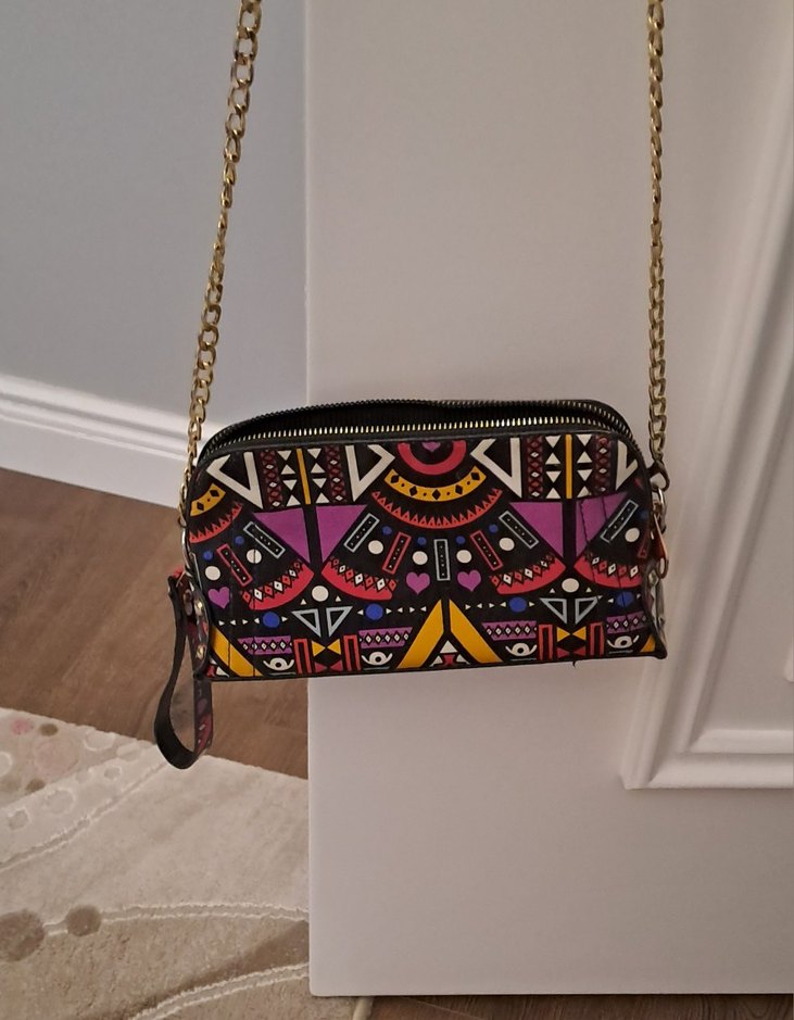 Renkli baskılı ve zincir detaylı günlük kullanıma uygun kadın çantası.