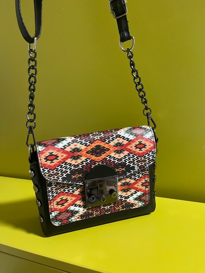 Renkli çanta, bohem tarzda zincir detaylarıyla dikkat çekiyor. Ayarlanabilir askısı ve metal kilitli kapaklıdır.