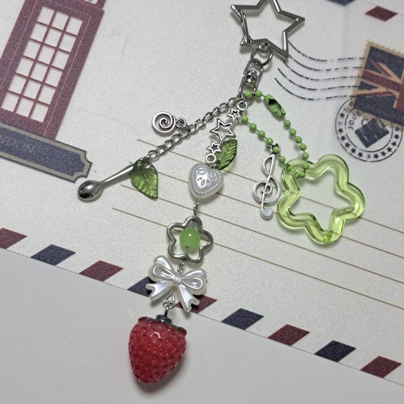Renkli zincir detaylı, çilek, fiyonk, müzik notası ve yıldız figürlü bohem tarzda kadın anahtarlık.