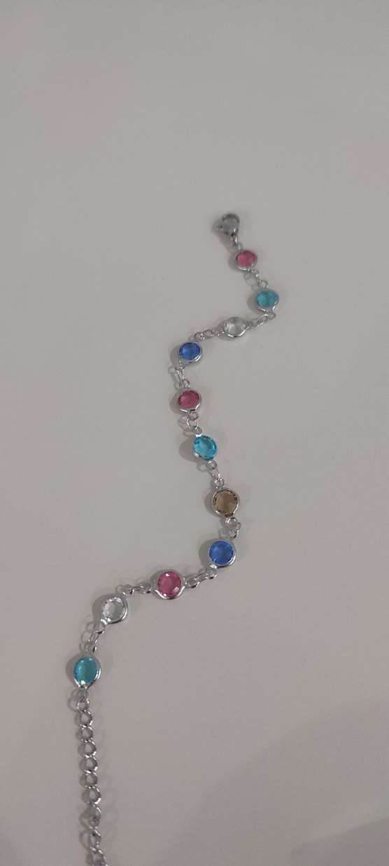 Zincir detaylı ve renkli taşlarla tie-dye deseninde, bohem ve gösterişli çelik kadın bileklik. Kararma ve solma yapmaz