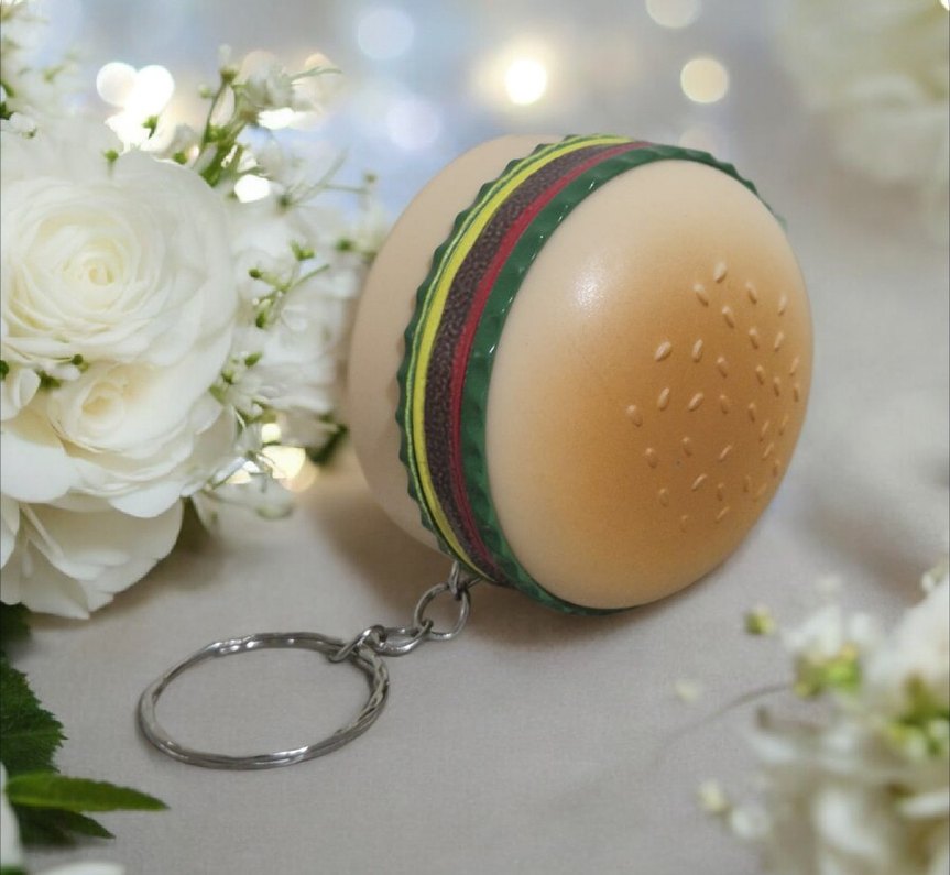 Bohem ve retro tarzı yansıtan, detaylı zincirli renkli hamburger şeklinde anahtarlık.
