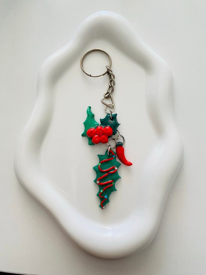 Canlı kırmızı ve yeşil figürlü, zincir detaylı renkli kadın anahtarlık. Bohem ve retro tarzı yansıtır.