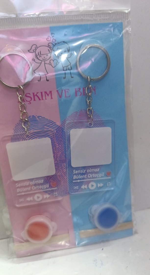 Müzik çalar tasarımlı, "Sensiz olma, Bülent Ortaçgil" yazılı, renkli zincir detaylı kadın anahtarlıklar. Minimalist ve eğlenceli tarzda.