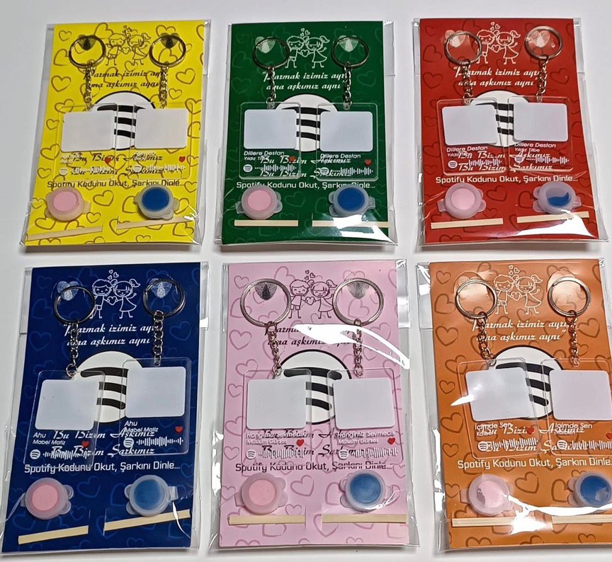 Renkli, zincir detaylı kadın anahtarlıkları. Her pakette iki anahtarlık ve iki düğme bulunur. Spotify kodu yazılıdır.