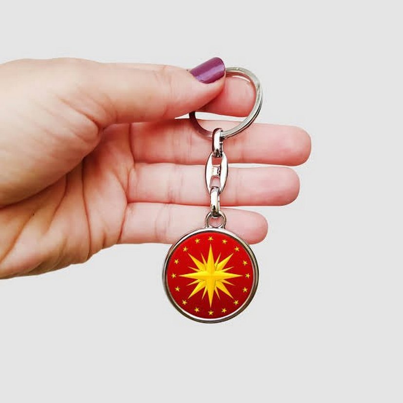 Canlı kırmızı ve sarı yıldız desenli, zincir detaylı renkli kadın anahtarlık. Minimalist ve bohem tarzlara uygundur.
