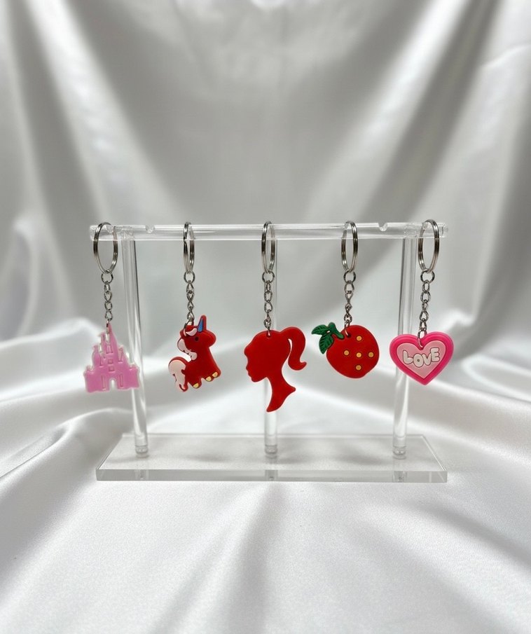 Pembe tonlarda zincir detaylı, renkli ve pop kültür temalı kadın anahtarlık seti. Trend belirleyiciler için ideal.