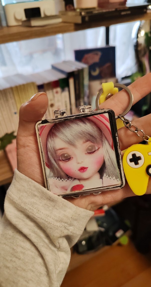 Renkli ve zincir detaylı kadın anahtarlık, retro tarzı bebek resmi ve sarı oyun konsolu figürü içerir. Bohem ve hippie tarzına uygundur. ️