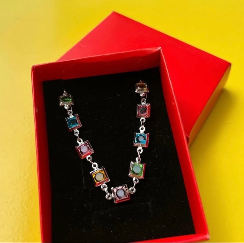 Zincir detaylı, çok renkli kare taşlarla süslenmiş bileklik günlük kullanıma uygun.