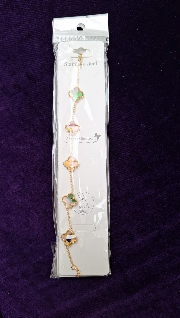 Kadın bilekliği, renkli baskılı yonca figürlü ince zincir detayına sahiptir. Bohem ve minimal tarzda, günlük kullanıma uygundur. Paslanmaz çeliktendir.