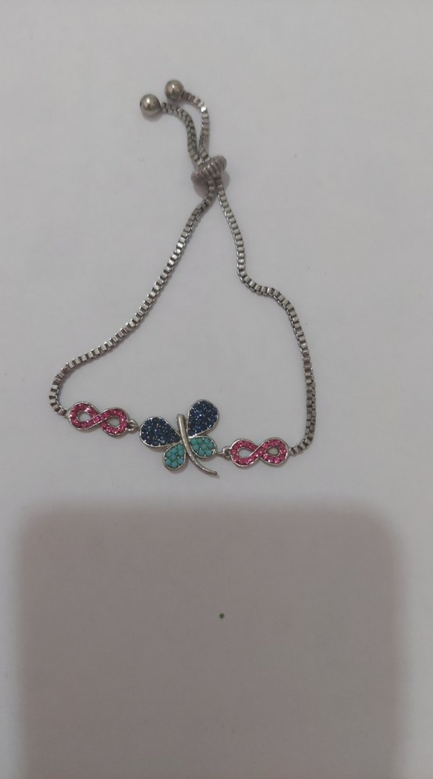 Renkli taşlarla süslenmiş kelebek ve sonsuzluk sembollü zincir detaylı kadın bileklik.