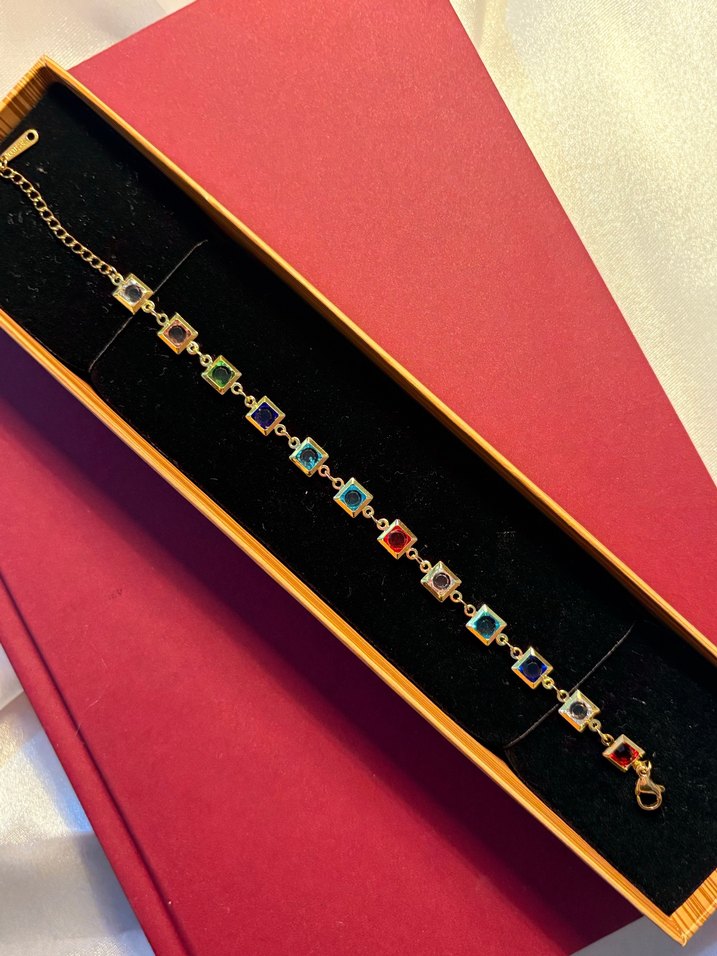 Renkli baskılı kare taşlar ve zincir detayına sahip bohem tarzda kadın bileklik, romantik akşamlar için uygun.